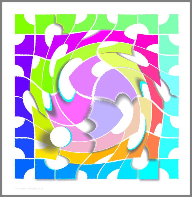Diese Bild im Format 100 x 100 cm wurde in Schirnding zum ersten Mal öffentlich gezeigt. Es ist ein für seine bisherigen Arbeiten etwas untypisches Werk von Norbert Ernst Herrmann. Es zeigt die Drehung einer Scheibe, die auf der Vorder - und Hinterseite jeweils andere Farben annimmt. Was für das Werk des Künstlers typisch ist: dass sich aus der Konstellation aus der Mitte heraus, eine neue Bewegung entwickelt.