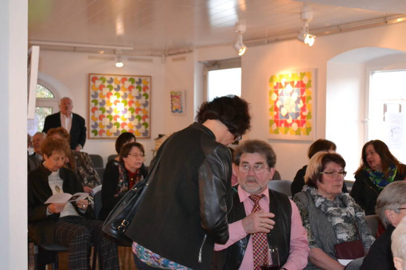 Erika Klos hielt sich nicht lange mit dem Werdegang des Künstlerkollegen auf, sondern brachte dessen visuellen Ambivalenzbegriff in Auseinandersetzung mit Victor Vasarely auf den Punkt: Im Gegensatz zu Vasarely seien nicht lediglich Wahrnehmungstäuschungen als Augenreize Programm, sondern echte, wenngleich illusionistische Ebenen der Wahrnehmung zwischen Vordergrund und Hintergrund, die in der Vervielfachung gegensätzliche Seh-Eindrücke erzeugten, die durch eine paradoxe Schattengebung ambivalente Wahrnehmungen ergeben würden. Man wisse im Detail nie, was ist nun Vordergrund, ja, den gebe es - doch gleich wird mit wanderndem Blick auf dem Bild dieser wieder zum Hintergrund und umgekehrt. Norbert Ernst Herrmann, fasste Klos zusammen, sieht das als Charakteristikum unserer Zeit, denn in der Tat: wüssten wir nicht oft was ist nun wichtig, was ist Sache, was ist wahr, was nicht? Solche Fragen seien dem Künstler wichtig (siehe hier unten sein Text) und er gebe sie in seiner Kunst an die betrachtende Person zurück, bzw. beziehe sie mit ein. Die Ausstellungseröffnung war sehr gut besucht und auch eine erstklassige Musikdarbietung von zwei Künstler*innen, die im Buch fotografisch dargestellt wird, sorgte für ausgezeichnete Stimmung und viel Applaus des Publikums.